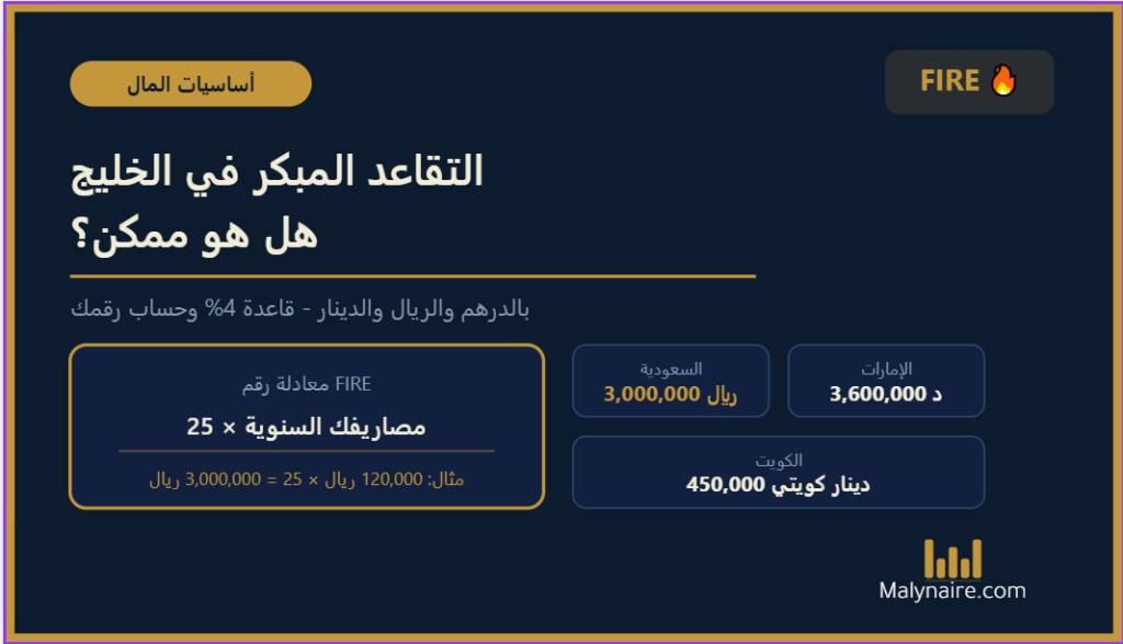 بالدينار الكويتي: مصاريف شهرية 1,500 دينار = سنوي 18,000 دينار. رقم FIRE: 18,000 × 25 = 450,000 دينار.